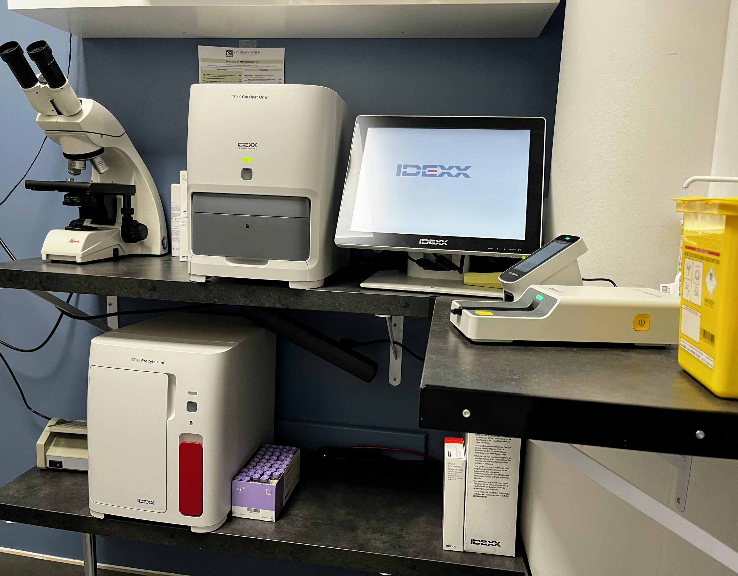 Le laboratoire permet de réaliser des analyses sanguines hématologiques (globules rouges/blancs et plaquettes), biochimiques (fonctionnement des organes tels que reins, foie, système digestif..) et endocrinologiques (dosages thyroïde, progestérone, cortisol, lipase pancréatique, ccrp etc.)