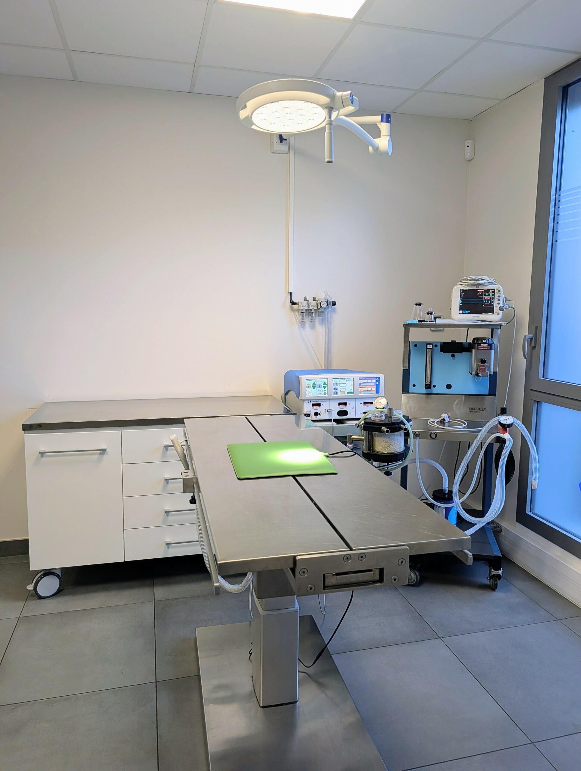 Le bloc opératoire est équipé de manière à répondre aux standards matériels actuels. L’anesthésie peut être entretenue sous oxygène avec un poste d’anesthésie gazeuse, et surveillée par un monitoring complet (électrocardiogramme, saturation en O2, capnographie et mesure de la pression artérielle non invasive).